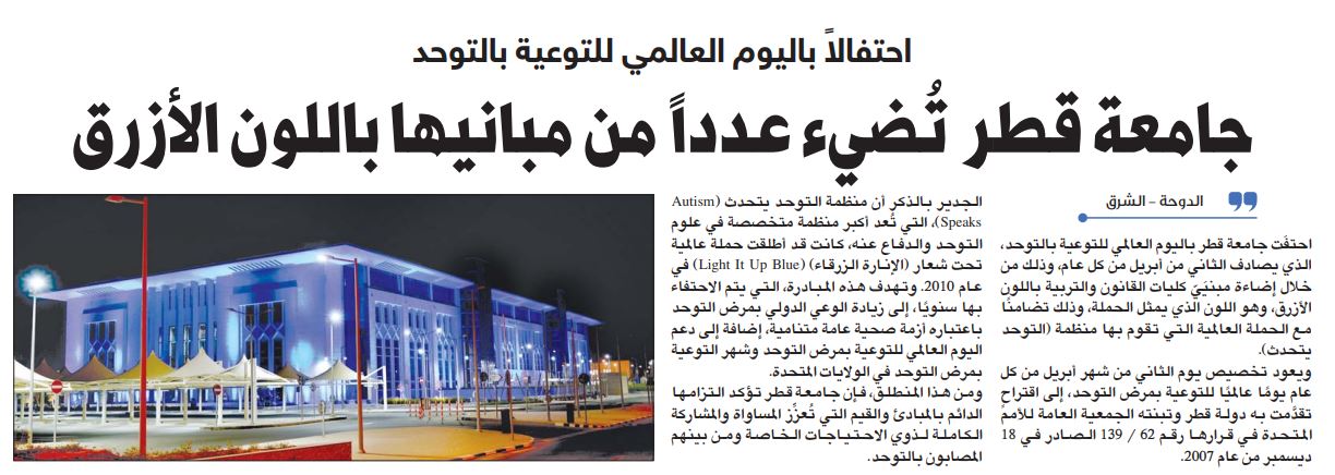 جامعة قطر تضيء عدداً من مبانيها باللون الأزرق