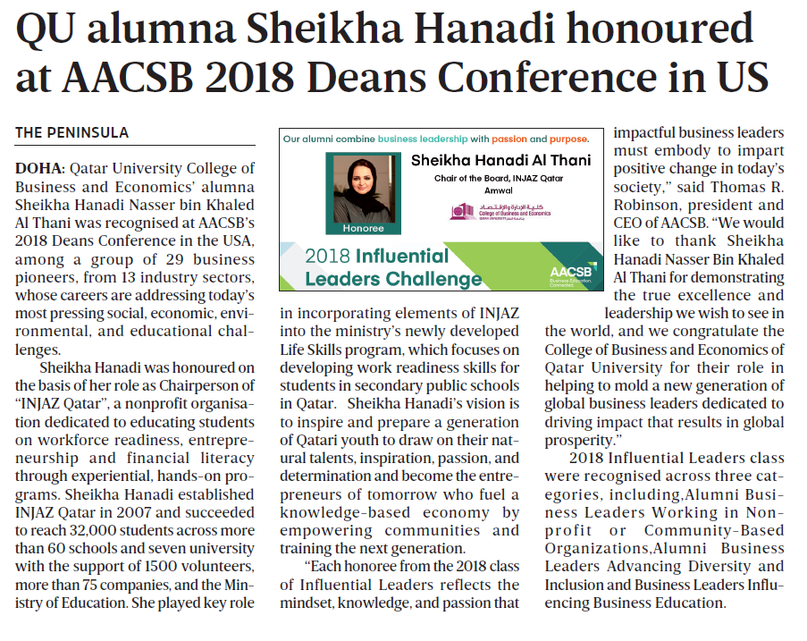 QU alumna Sheikha Hanadi honoured at AACSB 2018 Deans Conference in US