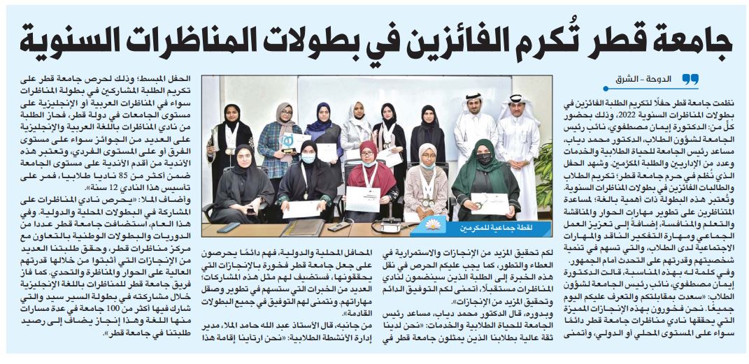 جامعة قطر تكرم الفائزين في بطولات المناظرات السنوية