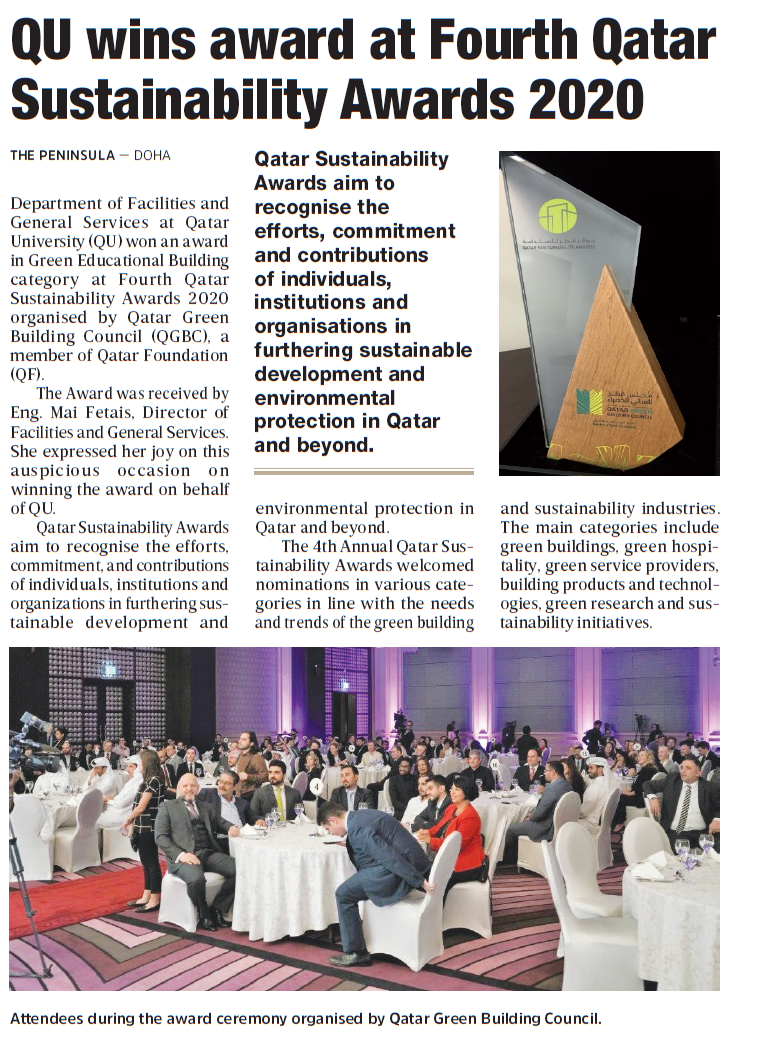 QU wins award at Fourth Qatar Sustainability Awards 2020