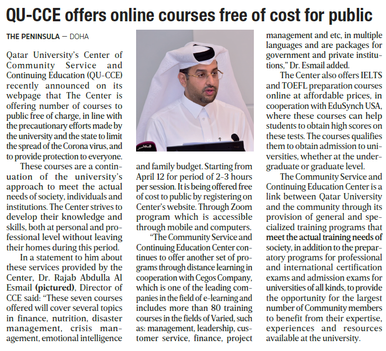 QU-CCE offers online courses free of cost for public