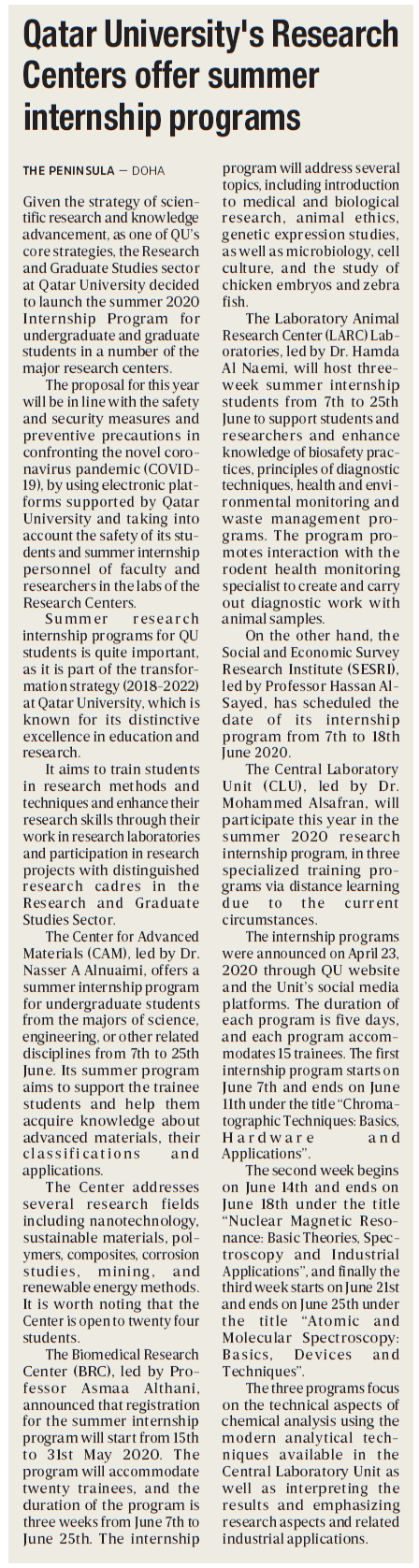 Qatar University's Research Centers offer summer internship programs