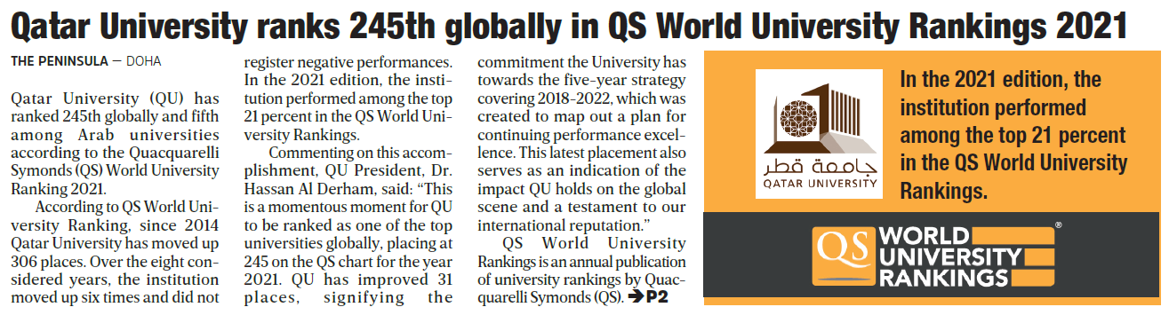 Qatar University ranks 245th globally in QS World University Rankings 2021