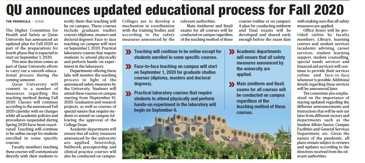QU announces updated educational process for Fall 2020