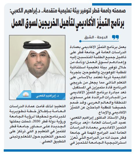 صممته جامعة قطر لتوفير بيئة تعليمية متقدمة.. د. إبراهيم الكعبي: برنامج التميز الأكاديمي الأكاديمي لتأهيل الخريجين لسوق العمل