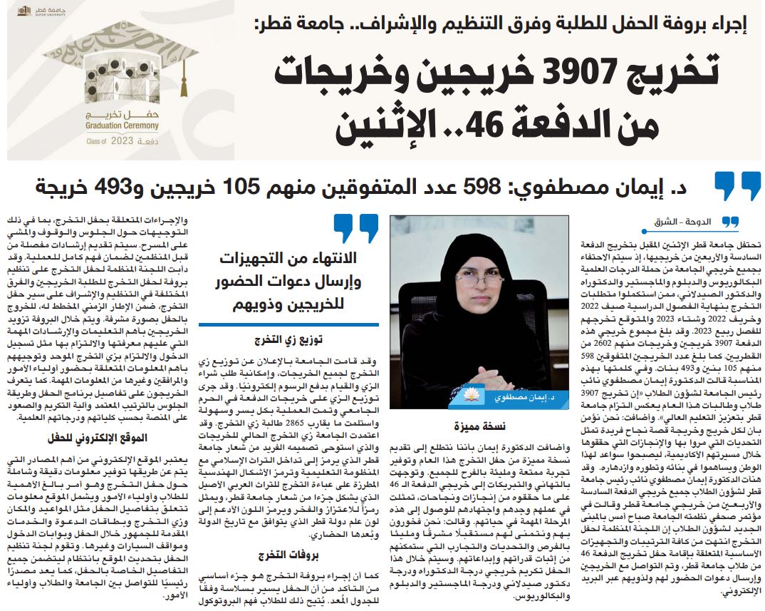 إجراء بروفة الحفل للطلبة فرق التنظيم والإشراف.. جامعة قطر: تخريج 3907 خريجين وخريجات من الدفعة 46 .. الإثنين