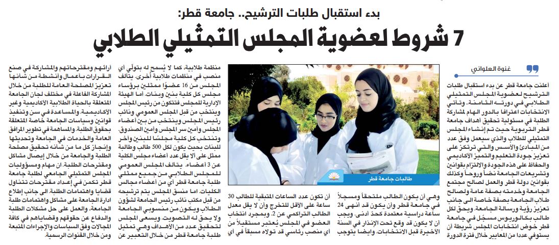 بدء استقبال طلبات الترشيح.. جامعة قطر: 7 شروط لعضوية المجلس التمثيلي الطلابي