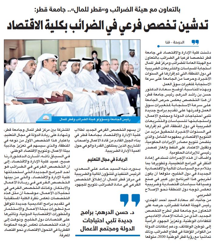 بالتعاون مع هيئة الضرائب و " قطر للمال ".. جامعة قطر: تدشني تخصص فرعي في الضرائب بكلية الاقتصاد