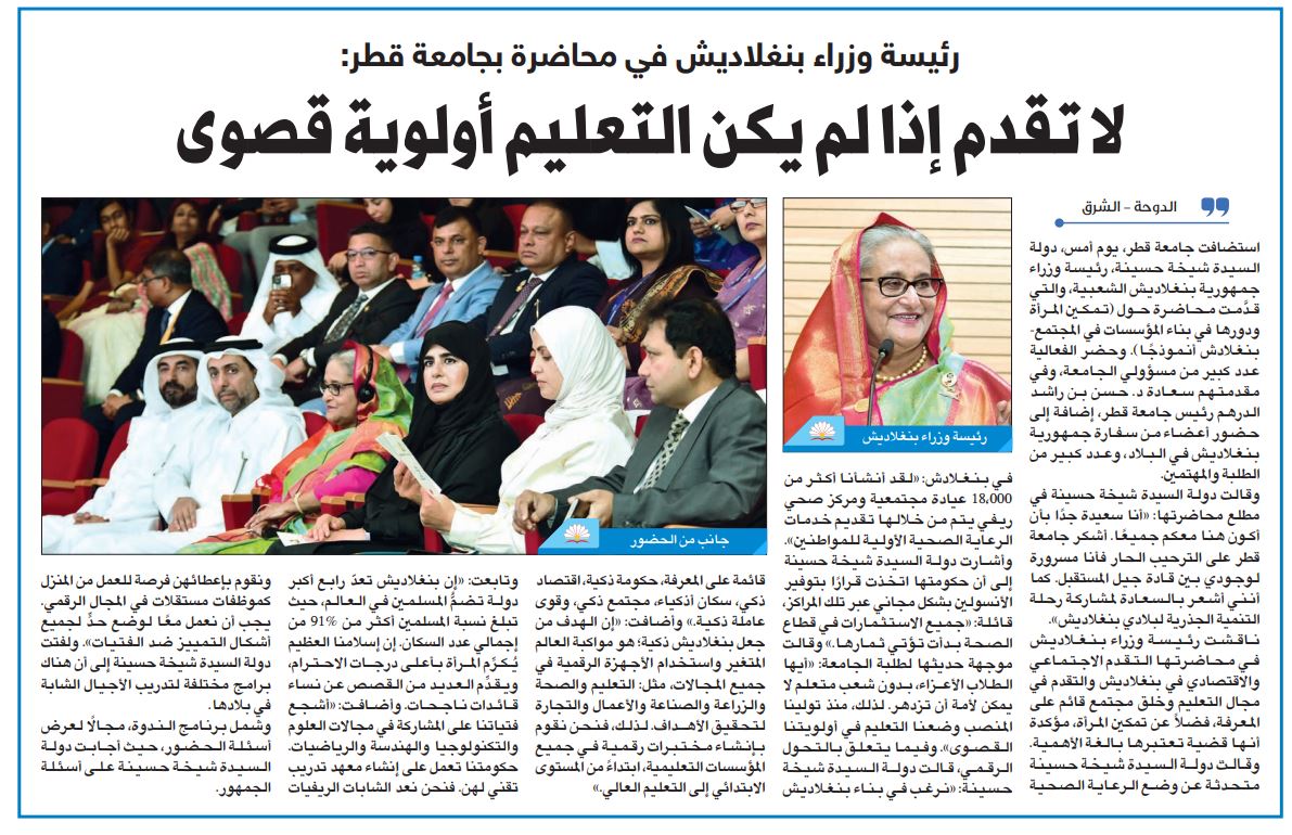 رئيسة وزراءجمهورية بنغلاديش في محاضرة بجامعة قطر: لا تقدم إذا لم يكن التعليم أولوية قصوى
