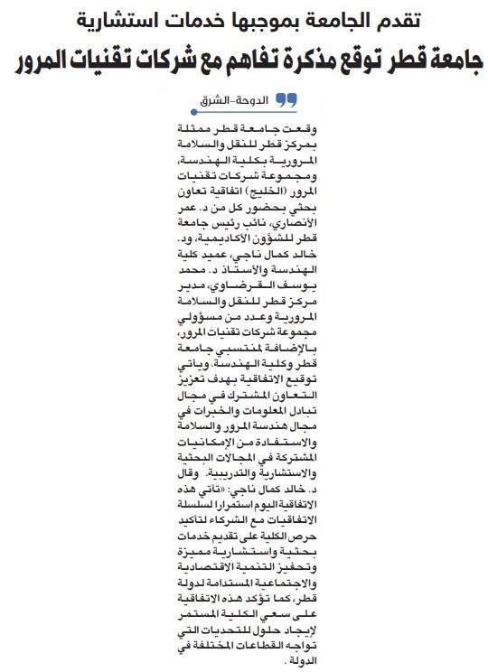 جامعة قطر توقع مذكرة تفاهم مع شركات تقنيات المرور
