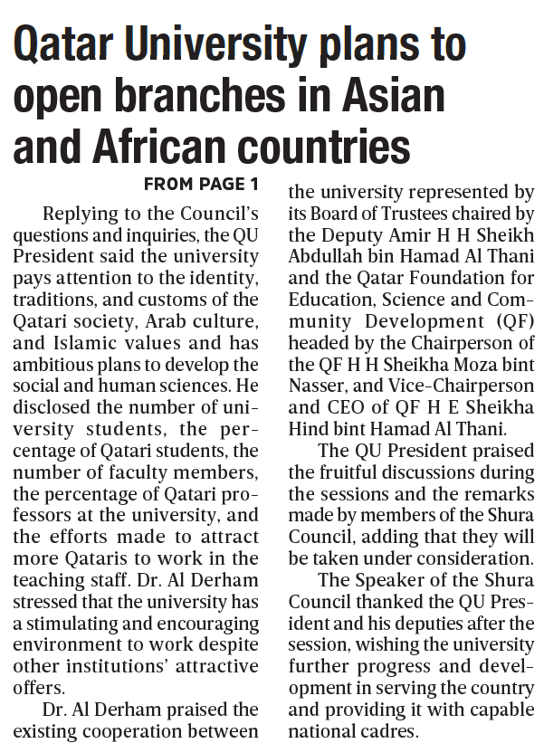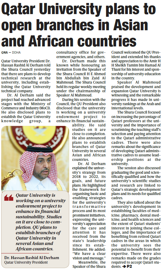 Description | Qatar University President Dr. Hassan Rashid Al Derham told the Shura Council that there are plans to develop technical research at the university, including establishing the Qatar University technical company. |