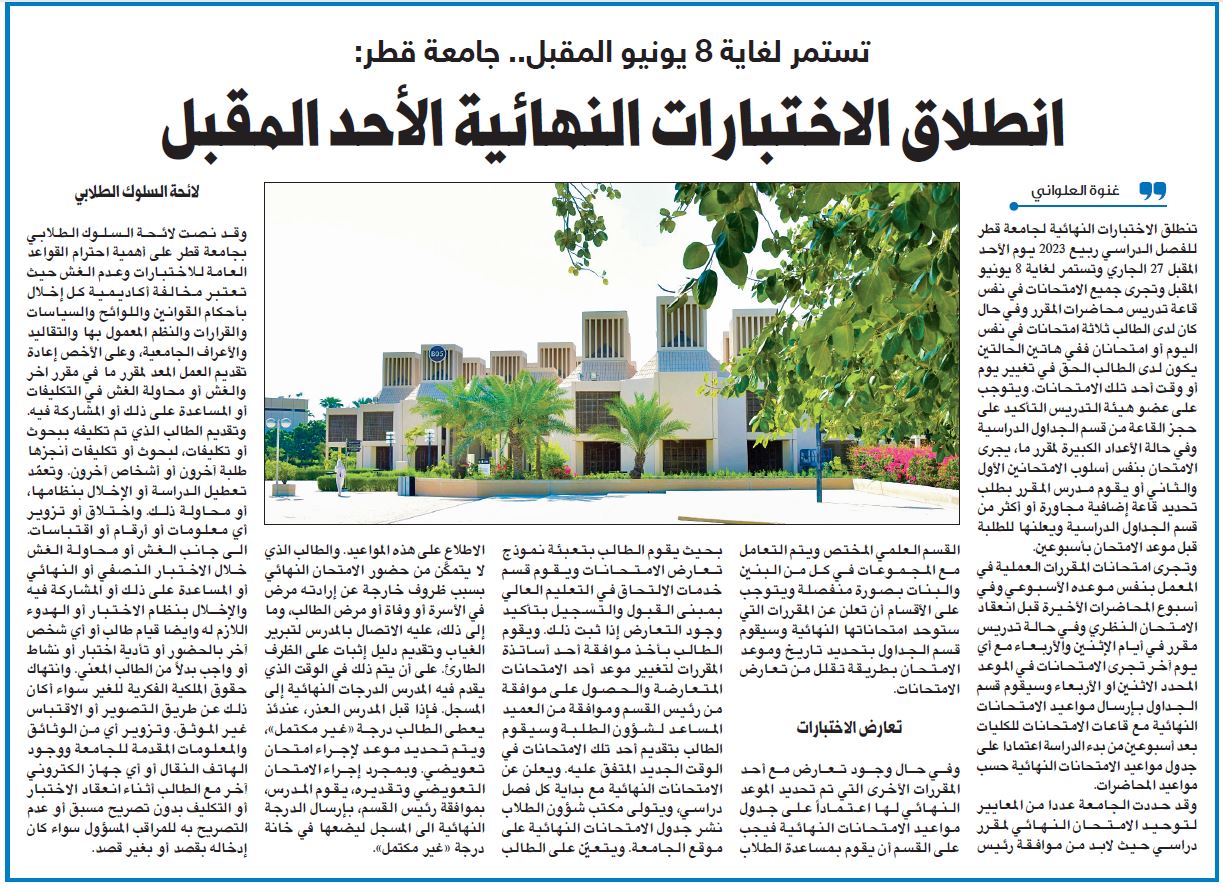 تستمر لغاية 8 يونيو المقبل... جامعة قطر: انطلاق الاختبارات النهائية الأحد المقبل