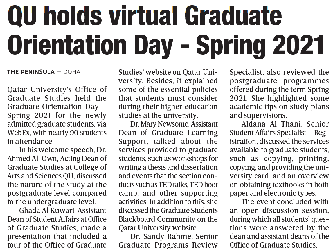 QU holds virtual Graduate Orientation Day - Spring 2021