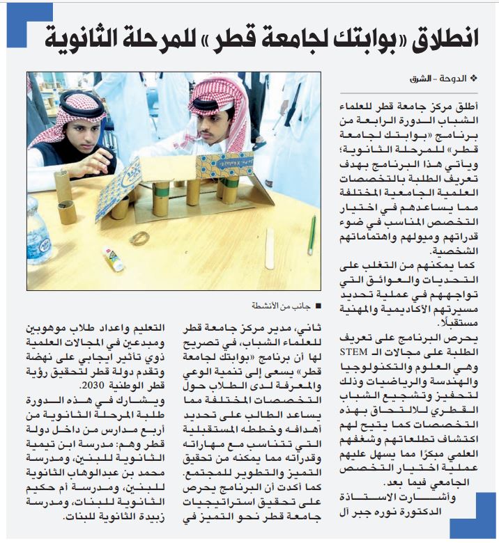 انطلاق "بوابتك لجامعة قطر" للمرحلة الثانوية