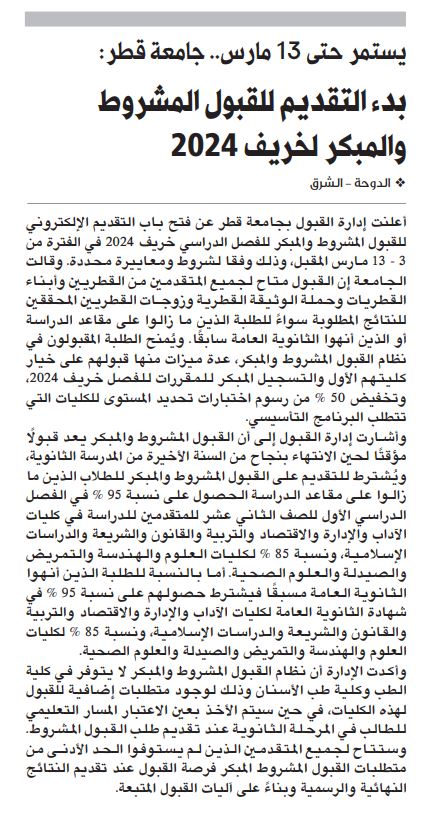 يستمر حتى 13 مارس.. جامعة قطر: بدء التقديم للقبول المشروط والمبكر لخريف 2024