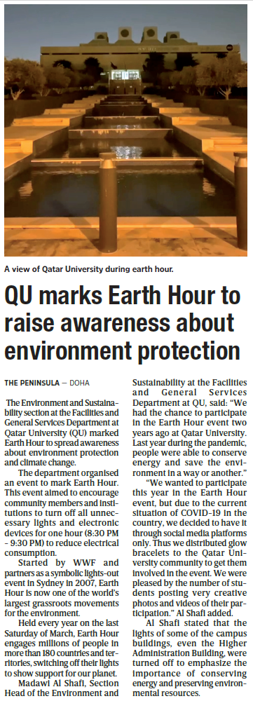 QU marks Earth Hour to raise awareness about environment protection
