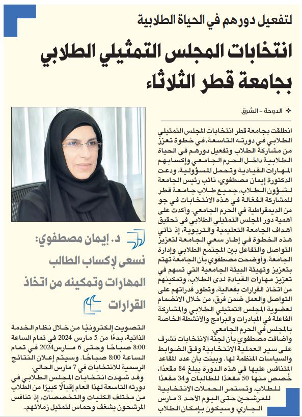 انتخابات المجلس التمثيلي الطلابي بجامعة قطر الثلاثاء