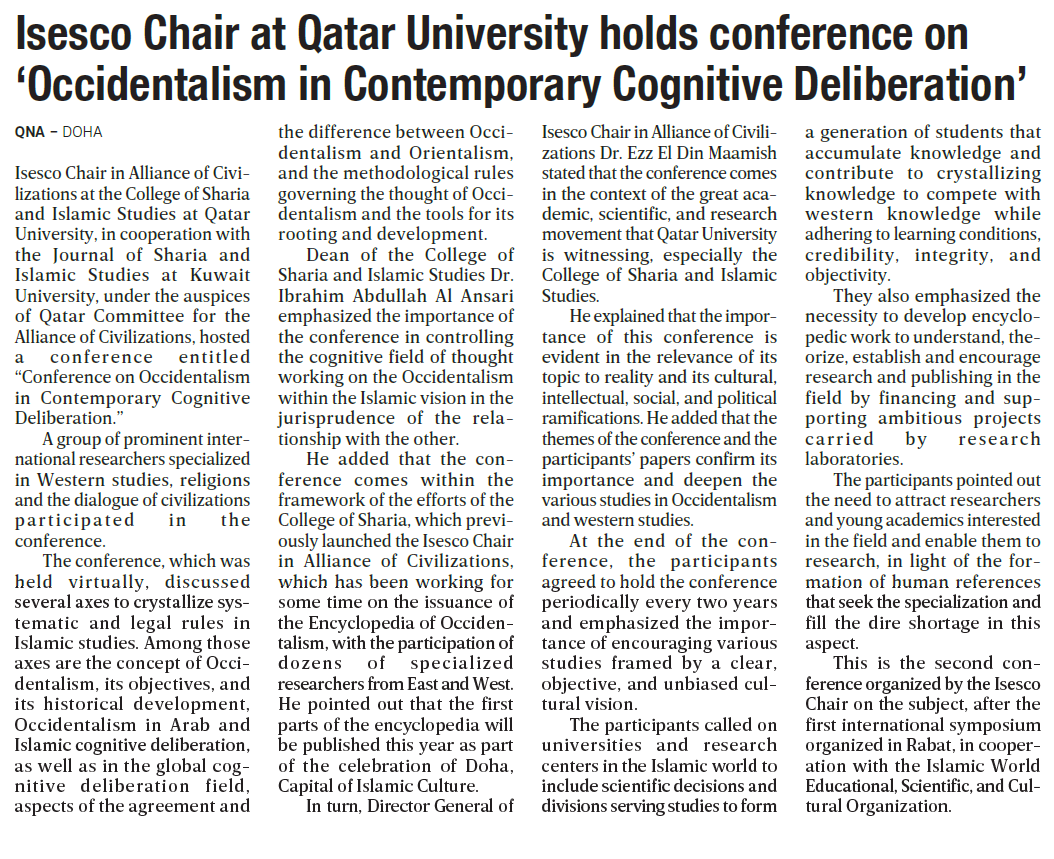 Isesco Chair at Qatar University holds conference on ‘Occidentalism in Contemporary Cognitive Deliberation’