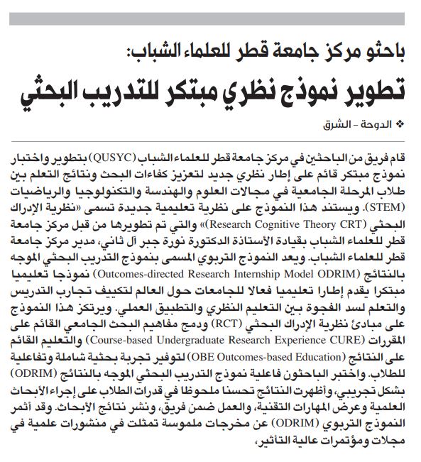 باحثو مركز جامعة قطر للعلماء الشباب: تطويرنموذج نظري مبتكر للتدريب البحثي
