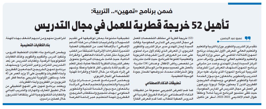 ضمن برنامج "تمهين".. التربية: تأهيل 52خريجة قطرية للعمل في مجال التدريس