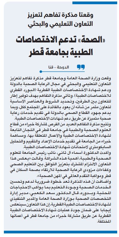 "الصحة" تدعم الاختصاصات الطبية بجامعة قطر