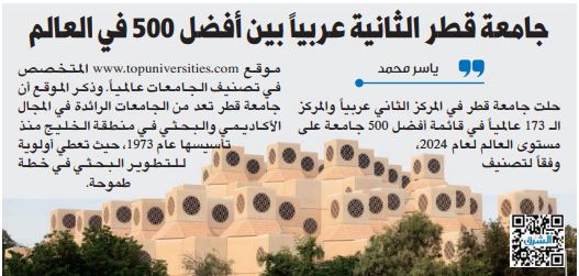 جامعة قطر الثانية عربيًا بين أفضل 500 في العالم