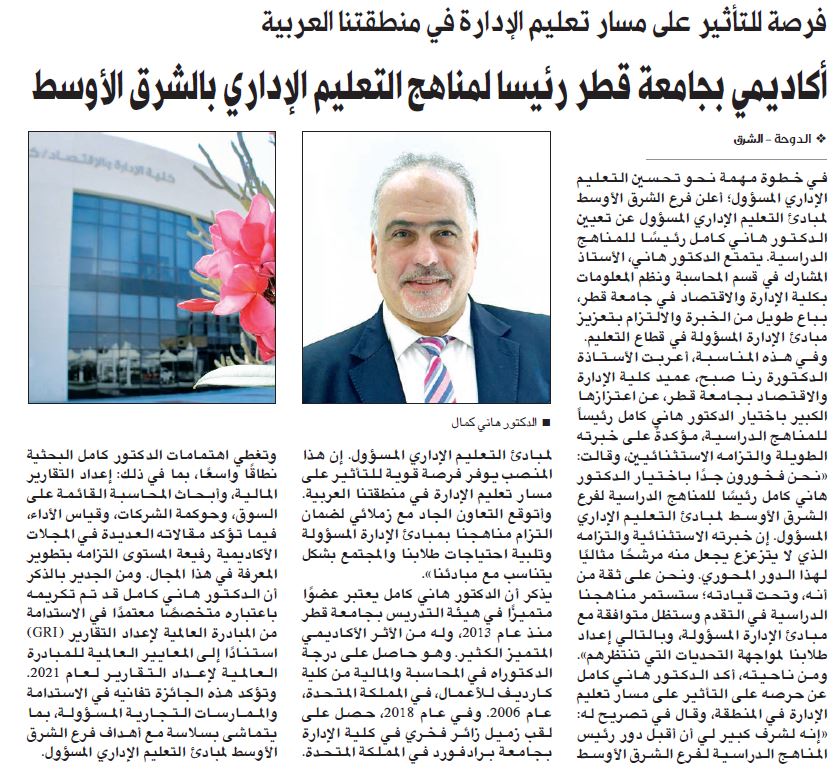 أكاديمي بجامعة قطر رئيسا لمناهج التعليم الإداري بالشرق الأوسط