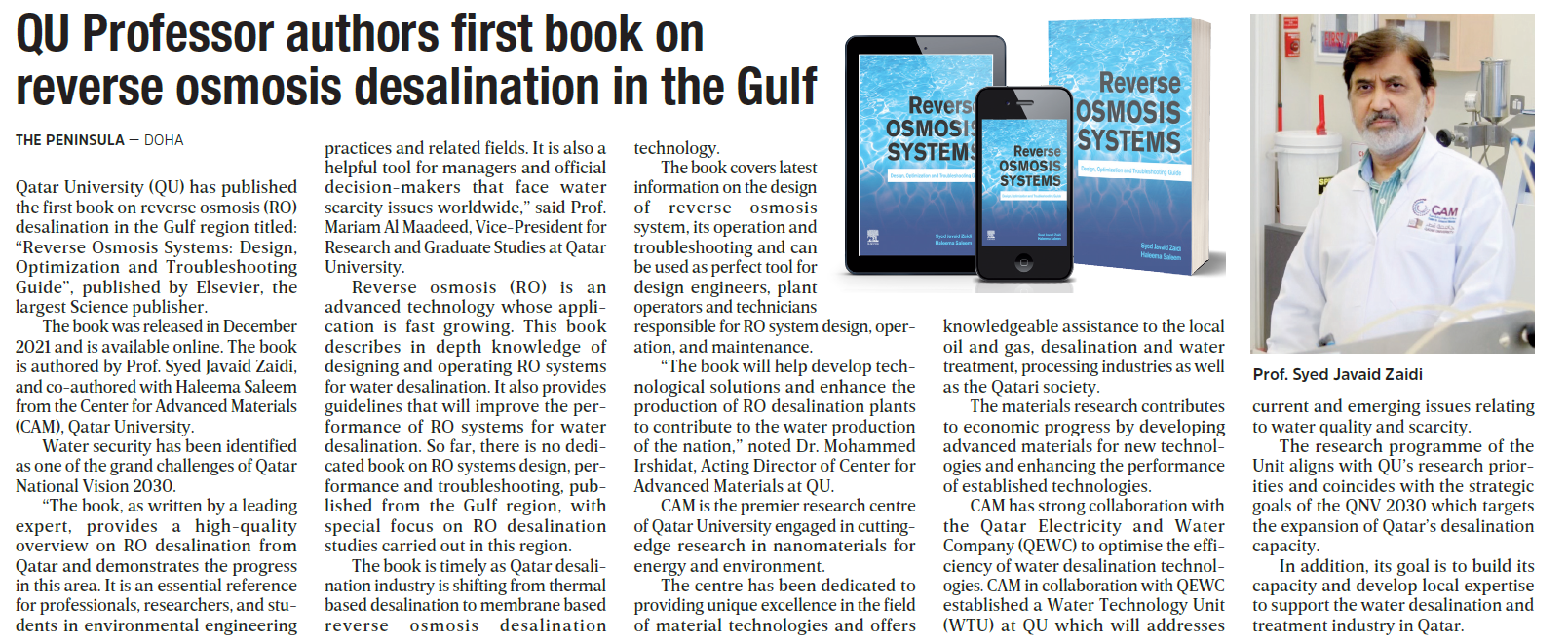 QU Professor authors first book on reverse osmosis desalination in the Gulf
