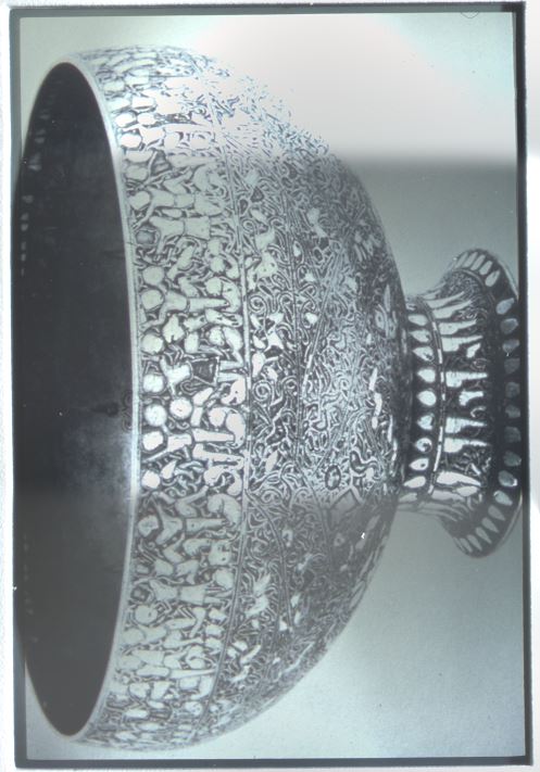 Brass cupbowl with silver inlay design dating from early 13th c.