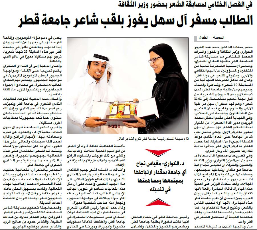 | الوصف | حصول الطالب مسفر آل سهل على لقب شاعر جامعة قطر وتكريمة من قبل الدكتورة شيخة المسند |