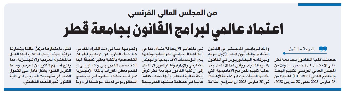 اعتماد عالمي لبرامج القانون بجامعة قطر