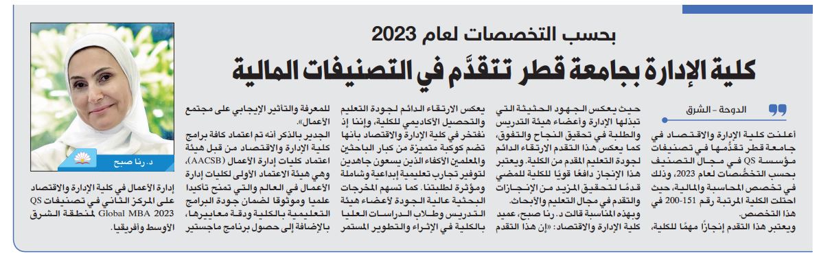 كلية الإدارة بجامعة قطر تتقدم في التصنيفات المالية