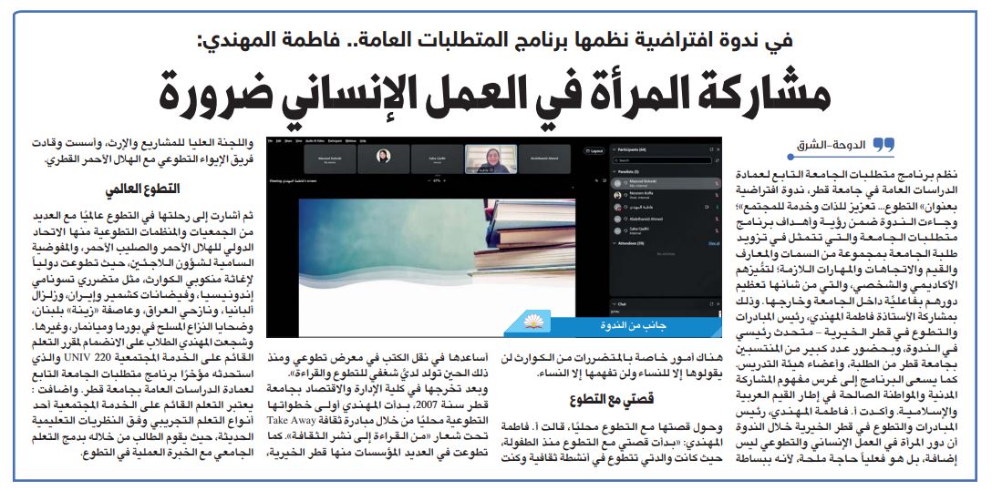في ندوة افتراضية نظمها برنامج المتطلبات العامة.. فاطمة المهندي: مشاركة المرأة في العمل الإنساني ضرورة