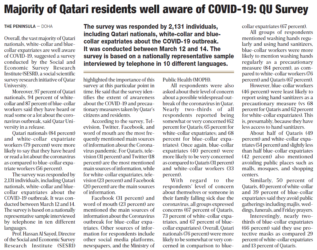 Majority of Qatari residents well aware of COVID-19: QU Survey