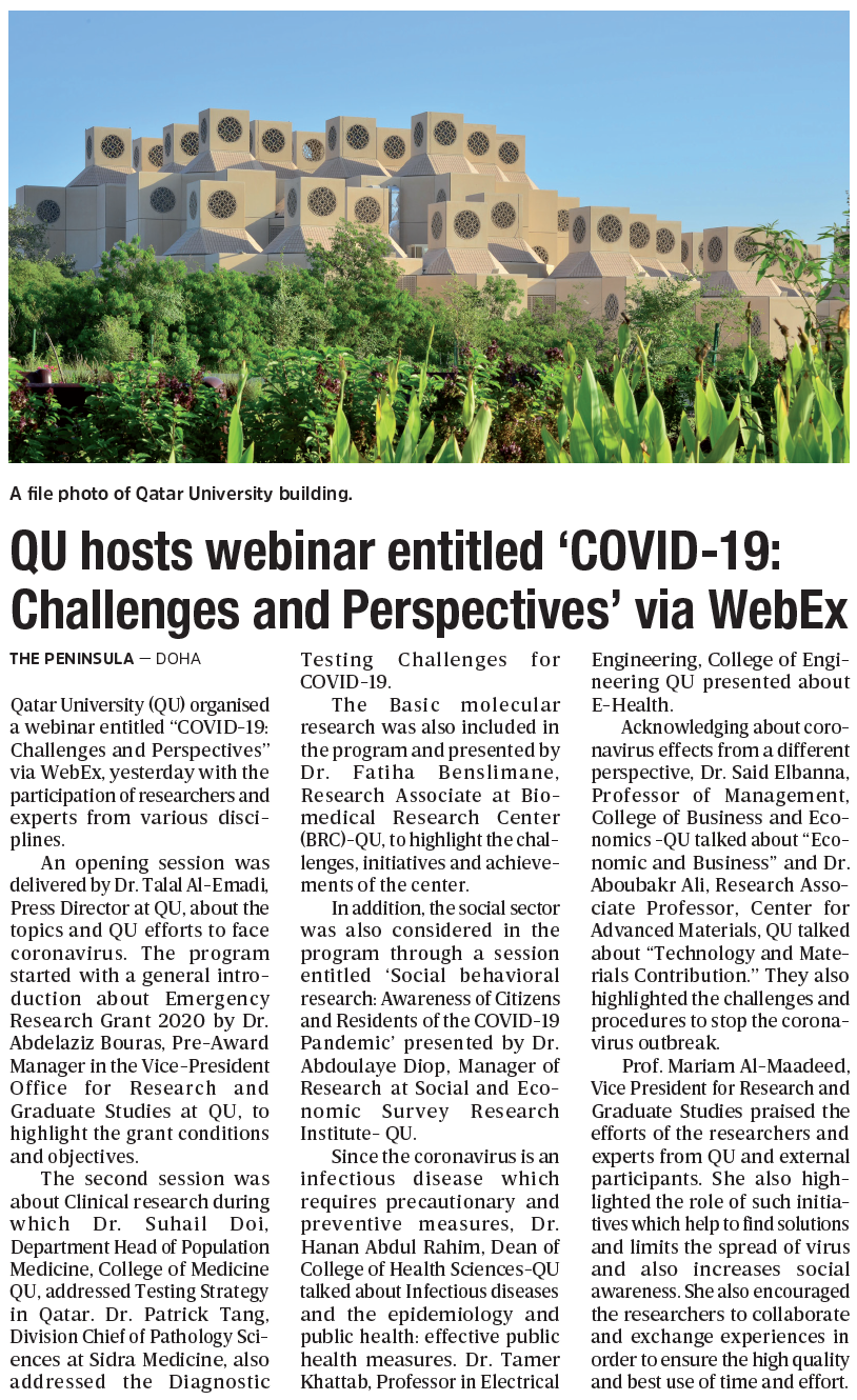 QU hosts webinar entitled ‘COVID-19: Challenges and Perspectives’ via WebEx