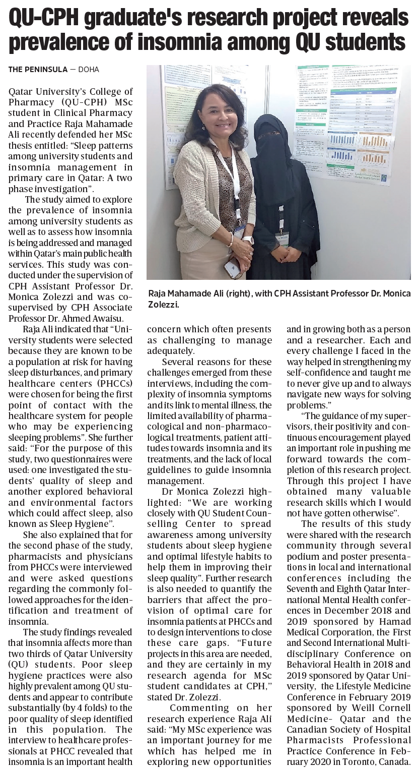 QU-CPH graduate's research project reveals prevalence of insomnia among QU students