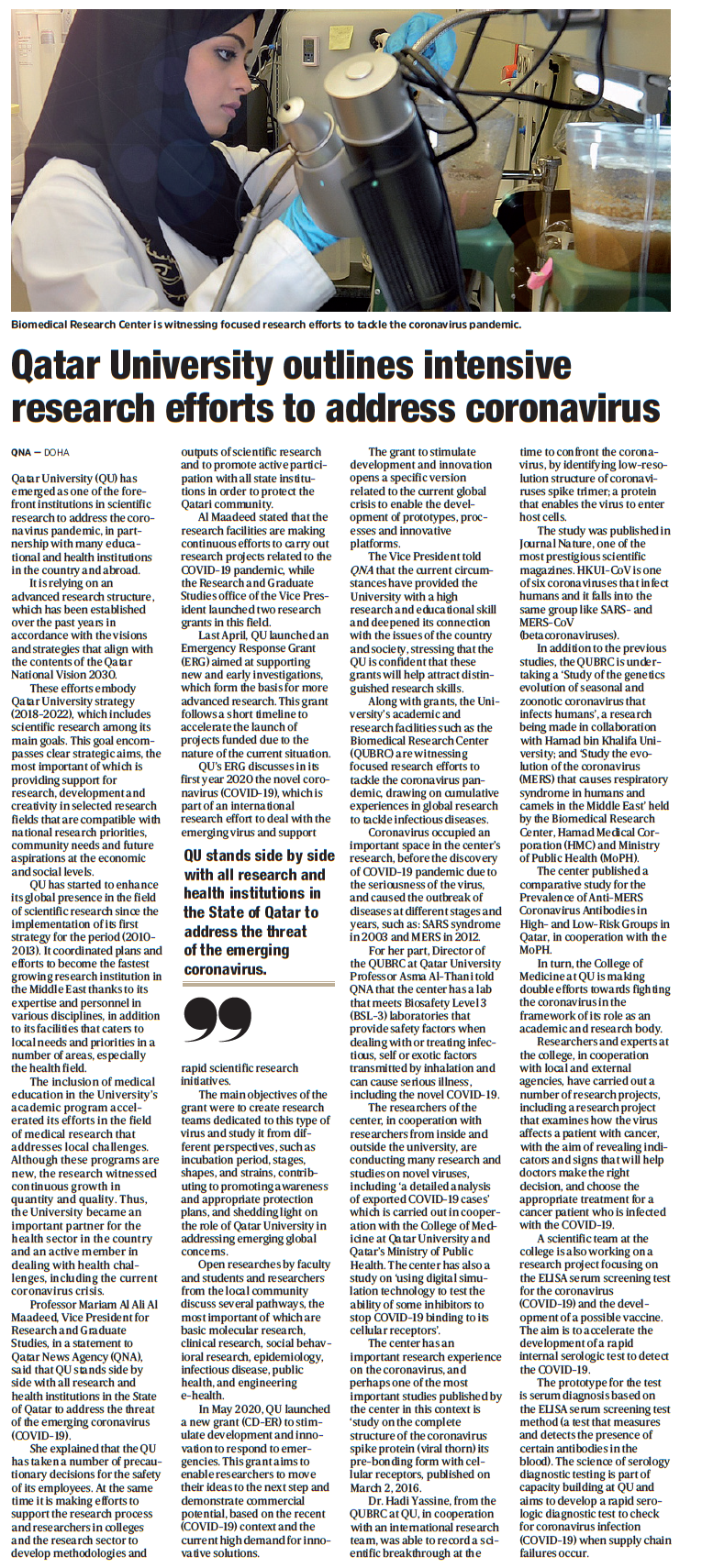 Qatar University outlines intensive research efforts to address coronavirus