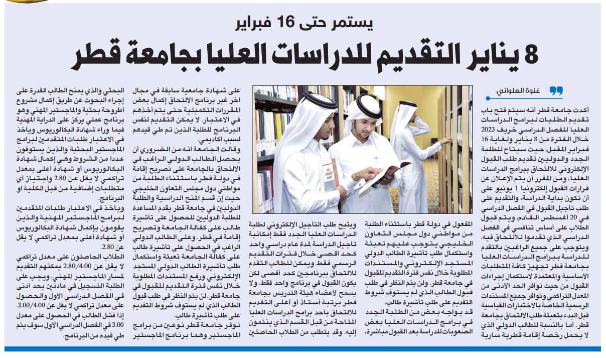 8 يناير التقديم للدراسات العليا بجامعة قطر