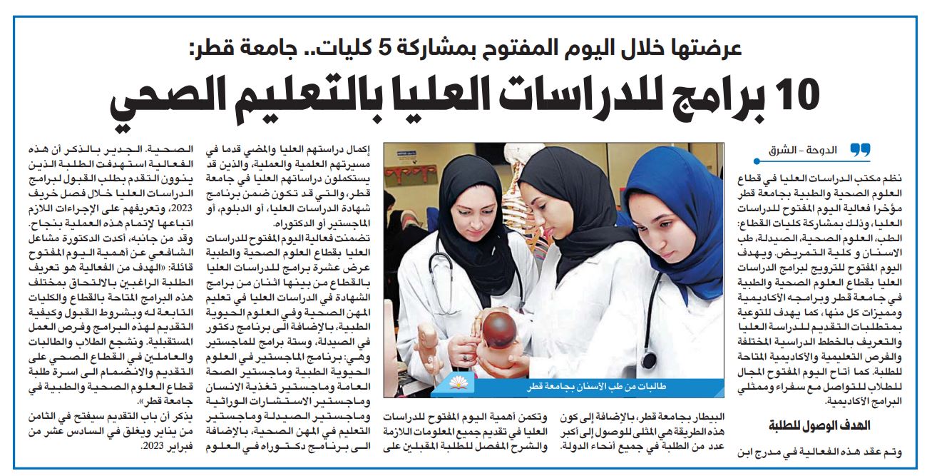 عرضتها خلال اليوم المفتوح بمشاركة 5 كليات.. جامعة قطر: 10 برامج للدراسات العليا بالتعليم الصحي