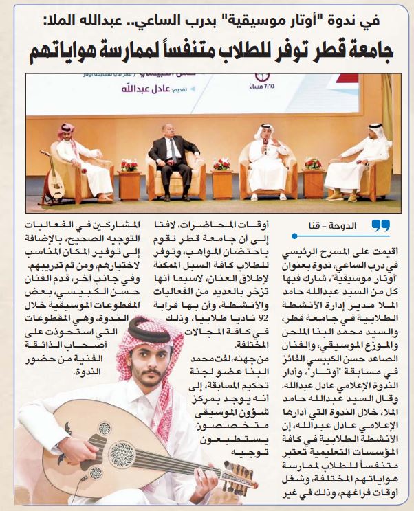 في ندوة "أوتار موسيقية" بدرب الساعي.. عبدالله الملا: جامعة قطر توفر للطلاب متنفساً لممارسة هواياتهم