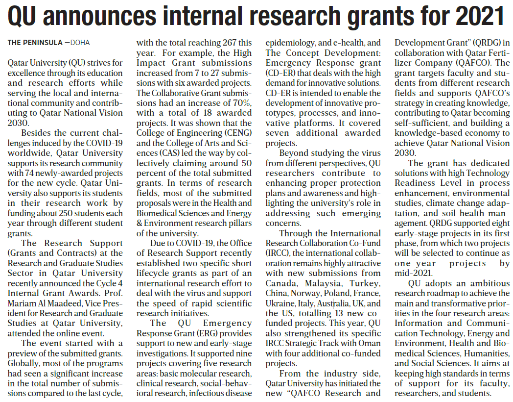 QU announces internal research grants for 2021