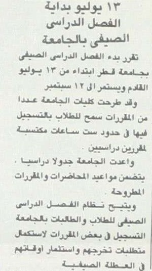 13 يوليو بداية الفصل الدراسي الصيفي بالجامعة