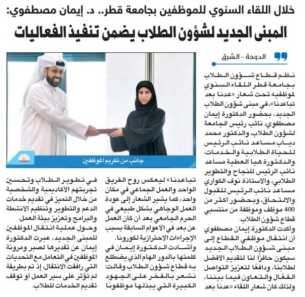 خلال اللقاء السنوي للموظفين بجامعة قطر.. د. إيمان مصطفوي: المبنى الجديد لشؤون الطالب يضمن تنفيذ الفعاليات