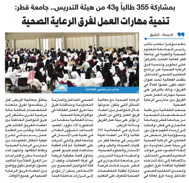 بمشاركة 335 طالباً و 43 من هيئة التدريس.. بجامعة قطر: تنمية مهارات العمل لفرق الرعاية الصحية