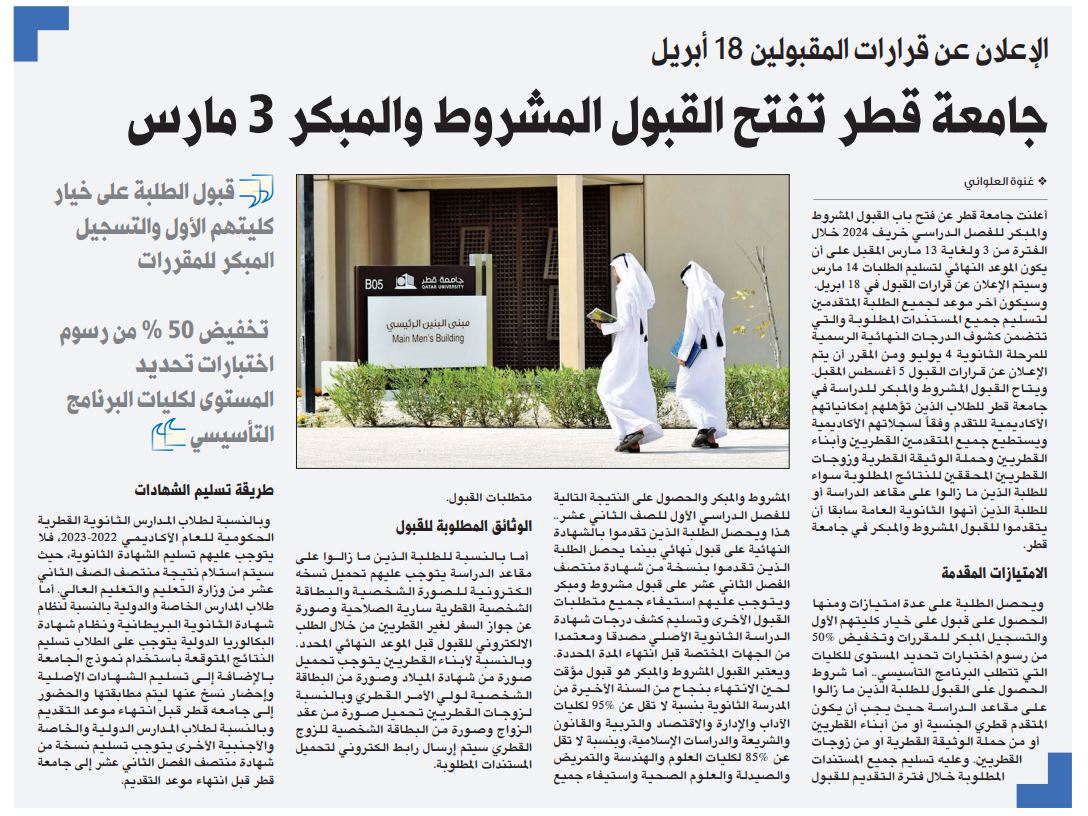 جامعة قطر تفتح القبول المشروط والمبكر 3 مارس