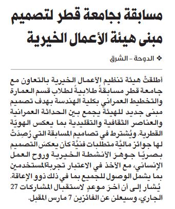 مسابقة بجامعة قطر لتصميم مبنى هيئة الأعمال الخيرية
