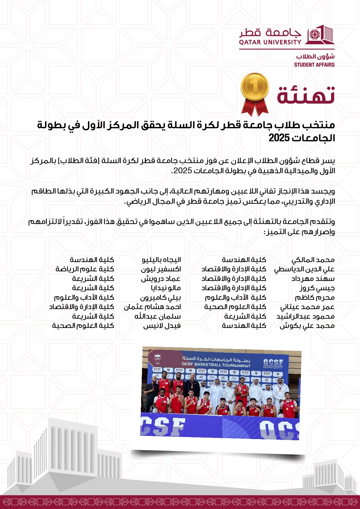 منتخب طلاب جامعة قطر لكرة السلة يحقق المركز الأول في بطولة الجامعات 2025