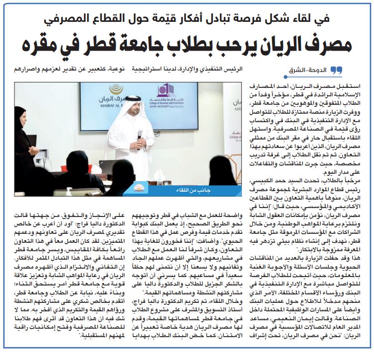 مصرف الريان يرحب بطلاب جامعة قطر في مقره