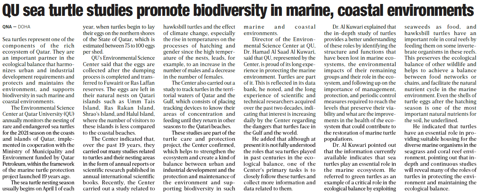QU sea turtle studies promote biodiversity in marine, coastal environments