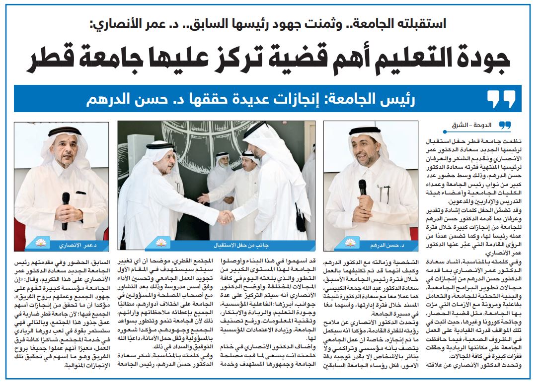 استقبلته الجامعة.. وثمنت جهود رئيسها السابق.. د.عمر الأنصاري: جودة التعليم أهم قضية تركز عليها جامعة قطر